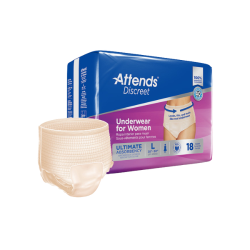 Expertly designed for women with moderate to heavy incontinence, ADUF30 - Attends Discreet Women's Underwear in size Large offers the perfect blend of comfort and confidence. Made with soft, breathable materials and barrier leg cuffs, these discreet underwear provide all-around protection while maintaining a secure fit. With tear-away side panels for easy removal, stay fresh and dry with Attends Discreet Underwear.