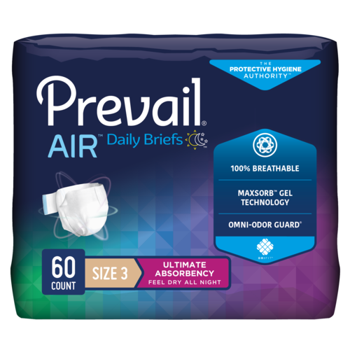 Prevail Air Briefs provide optimal protection, comfort, and breathability for individuals managing significant bladder or bowel leaks. The Prevail Microclimate Care™ system promotes a favorable microclimate by incorporating performance features that maintain normal skin temperature and moisture levels on the skin surface, promoting skin health. Microclimate Care™ includes: MaxSorb™ Gel Technology that traps wetness to leave you feeling fresher, cleaner, and drier; a 100% breathable moisture barrier for skin to breathe; Dri-Fit™ system to reduce friction and keep skin dry and healthy; Omni-Odor Guard™ that neutralizes odors before they arise; Skin Smart® Fabric with vitamin E, Aloe, and chamomile to safeguard skin; Expandex™ Wings for a better, more fitted feel; Easy-Lock Fastener® that grips and secures without stickiness; soft and comfortable Cloth-Like Outer Fabric; and Direct-Lock™ Panels for an adjustable fit. Prevail Air Brief