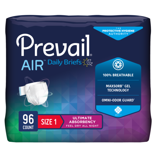 The Prevail Air Incontinence Brief provides ultimate protection, comfort, and breathability for heavy bladder or bowel leakage. The Prevail Microclimate Care™ system creates a healthy microclimate with features such as MaxSorb™ Gel Technology, a breathable moisture barrier, and Skin Smart® Fabric. Stay dry, fresh, and odor-free with Prevail Air. 20 count size 1 medium.