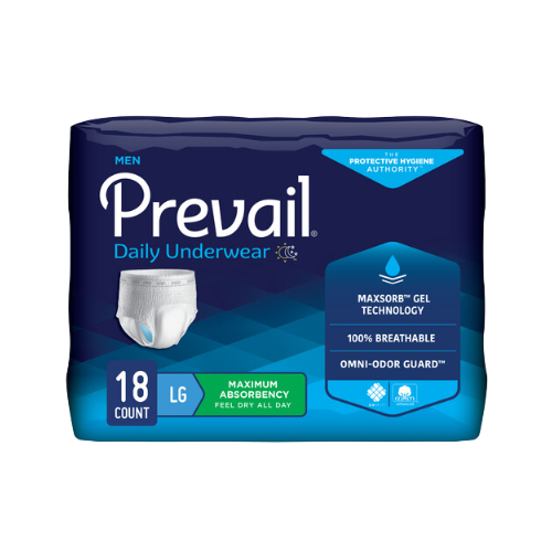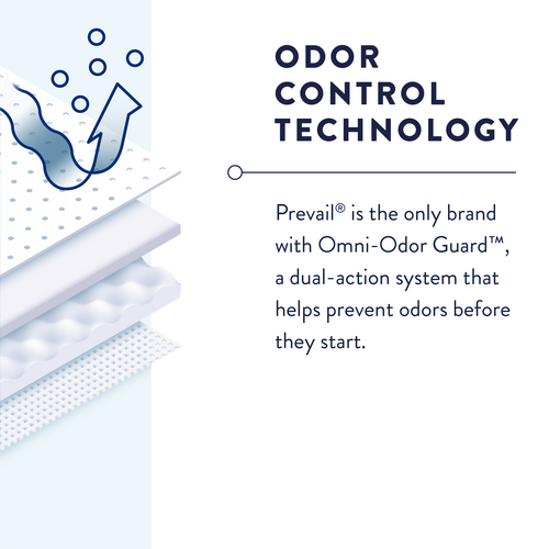 Each Prevail® protective undergarment is engineered for 4 key aspects: comfort, absorbency, skin health, and discretion. Specifically tailored for men with moderate to heavy incontinence, Prevail® underwear offers 5X more dryness compared to the top competitor*. The exclusive MaxSorb™ Gel technology rapidly absorbs moisture, promoting a cleaner, fresher, and drier experience. Other beneficial features include the dual action Omni-Odor Guard® system, preventing unwanted odors, and 360° Breathable Zones™ to keep you cool and comfortable by circulating air throughout the entire underwear, reducing heat and moisture buildup. *Based on rewet testing of the leading protective underwear brand.