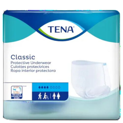 The TENA® Classic Protective Underwear offers moderate to heavy protection and a discreet, comfortable fit with soft, cloth-like, breathable materials. Its Super-absorbent polymers effectively lock away moisture and odor, while the Target Acquisition Zone and tear-away sides make for swift product changes. This unisex, disposable option provides moderate absorbency with a white cloth-like backing and elastic gathers, and is latex-free for sensitive skin.