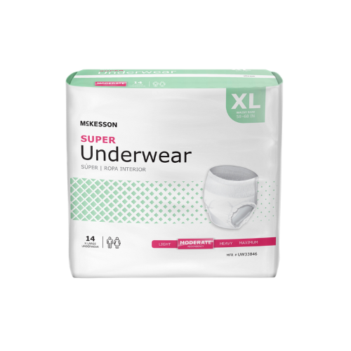 Introducing McKesson Super Incontinence Underwear, a unisex, disposable solution for moderate absorbency needs. This premium underwear features an advanced contoured dual-core, providing targeted absorbency and unparalleled leak protection. With tear-away sides, a soft stretch waist, and superior odor control, this is a comfortable and discreet option for managing incontinence.