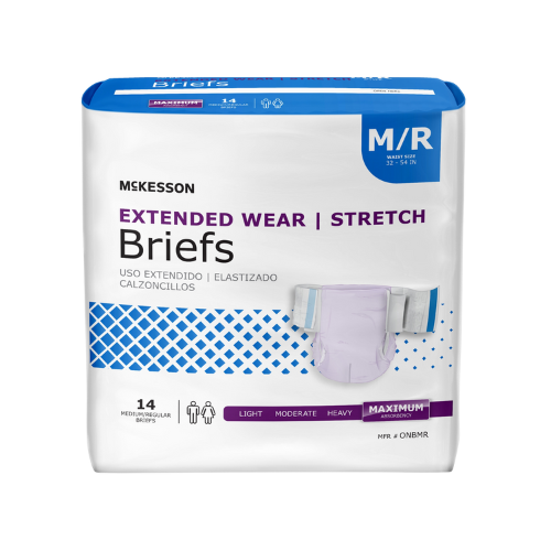 Experience superior protection for extended periods of time with the McKesson Extended Wear Incontinent Brief. Designed for both day and nighttime use, this unisex adult brief offers maximum absorbency and advanced dual-core performance to lock away wetness and control odor. The soft, cloth-like material and gentle leg gathers provide added comfort and protection. Refastenable hook-and-loop tabs and inner leg cuffs ensure a secure fit and added leak protection. Choose the trusted brand, not made with natural rubber latex.